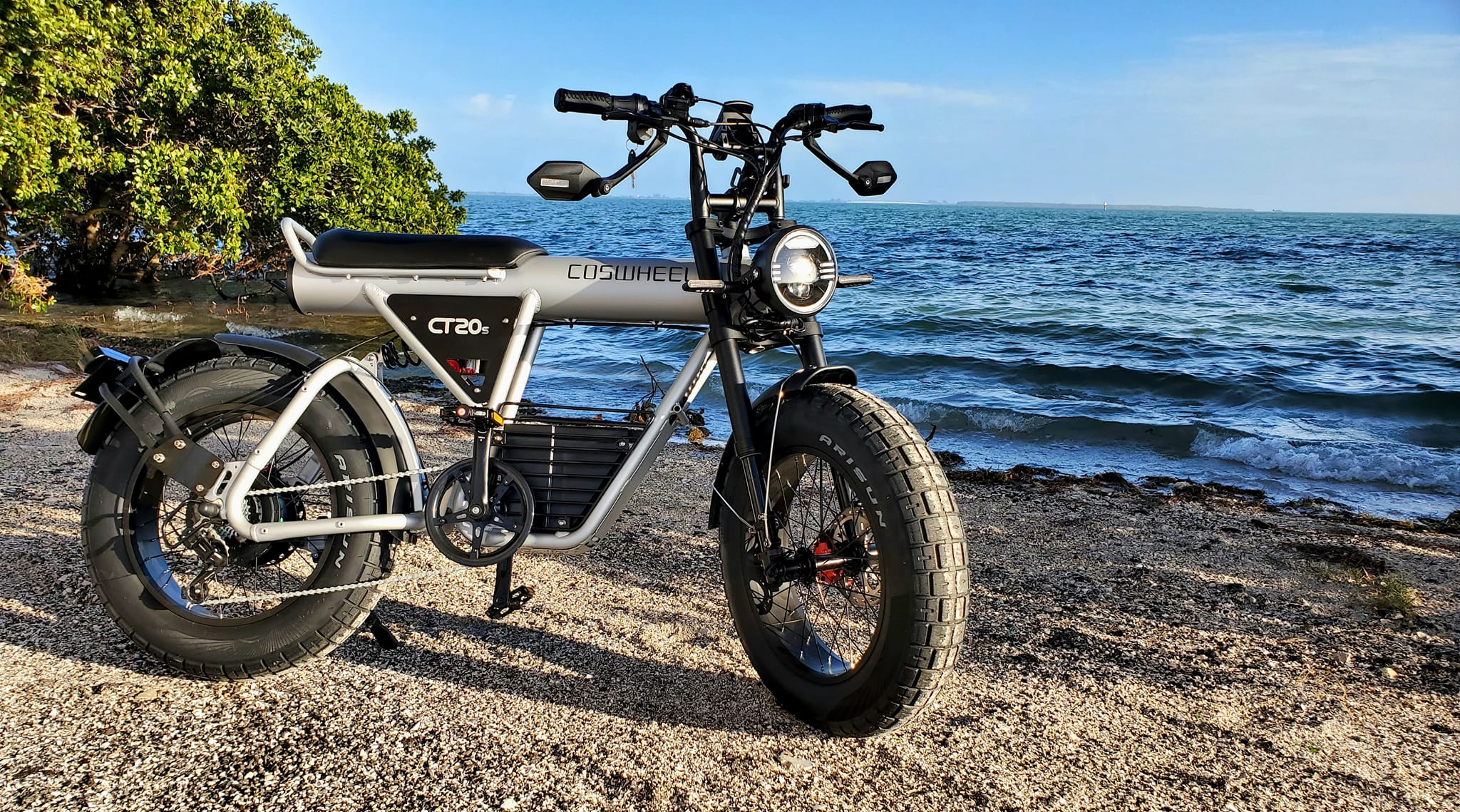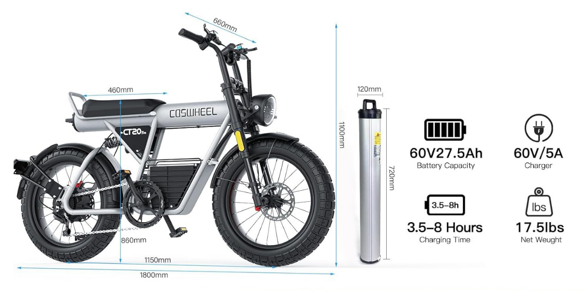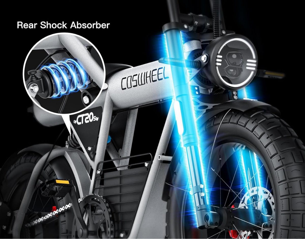 The Coswheel CT20S roars to life with a 2000W (1500W rated) brushless rear hub motor and 60V battery, reaching up to 40 MPH with 120N·m torque, turning hills into minor bumps and long rides into an invitation to explore.