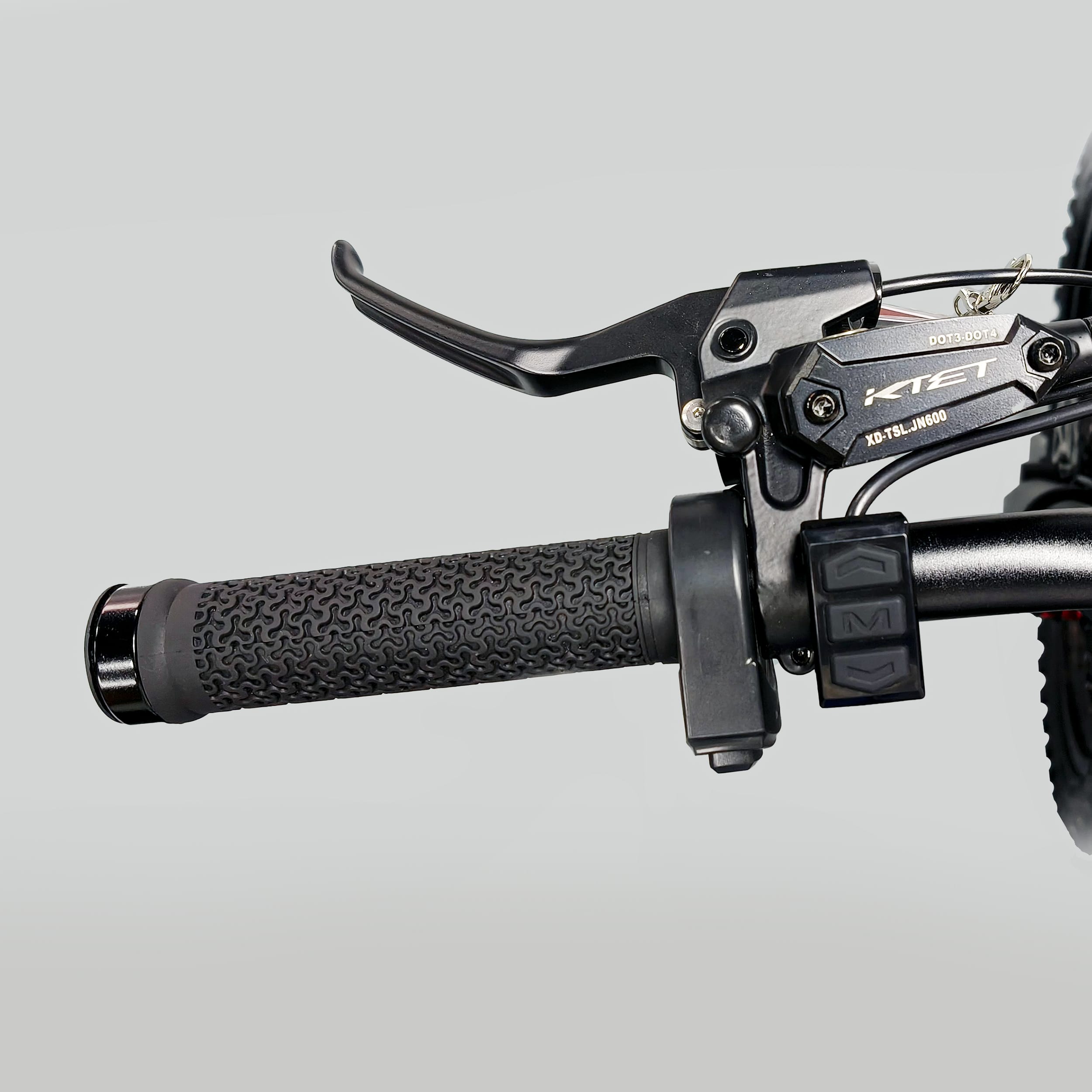 The rear suspension features a white 300mm adjustable damping shock absorber with blue knob for downward damping and red knob for upward damping. The front fork is an inverted hydraulic shock absorber with 200mm travel, adjustable via the red knob to control rebound speed. Every bump and drop is absorbed smoothly, keeping your ride stable, comfortable, and thrilling.